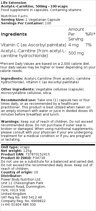 Sestavine: Acetil-L-karnitin (iz acetil-L-karnitin hidroklorida), vitamin C (kot askorbil palmitat) Druge sestavine: rastlinska celuloza (kapsula), mikrokristalna celuloza, silicijev dioksid. Priporočena uporaba: Vzemite eno (1) kapsulo dvakrat ali štirikrat na dan ali po priporočilu zdravnika. Ta izdelek je najbolje uporabiti na prazen želodec z vodo ali sokom v razdeljenih odmerkih 45 minut pred zajtrkom in kosilom. Opozorila: Hraniti izven dosega otrok. Ne prekoračite priporočenega odmerka. Ne kupujte, če je zunanji pečat zlomljen ali poškodovan. Pri uporabi prehranskih dopolnil se posvetujte z zdravnikom, če se zdravite zaradi zdravstvenega stanja ali če ste noseči ali dojite.
