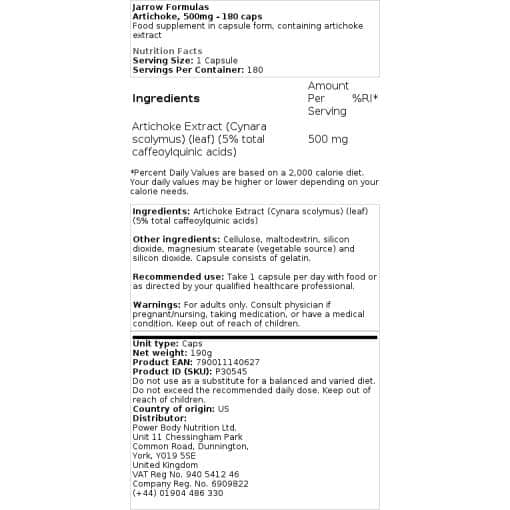 Sestavine: izvleček artičoke (Cynara scolymus) (list) (5 % [25 mg] skupne kafeoilkinske kisline) Druge sestavine: vegetarijanska kapsula (hidroksipropil metilceluloza, voda), celuloza, maltodekstrin, magnezijev stearat (rastlinski vir) in silicijev dioksid. Brez pšenice, glutena, soje, mlečnih izdelkov, jajc, rib/školjk ali arašidov/lepeščkov. Priporočena uporaba: Vzemite 1 kapsulo na dan s hrano ali po navodilih svojega usposobljenega zdravstvenega delavca. Opozorila: Pred uporabo tega izdelka se posvetujte z zdravstvenim delavcem, če poskušate zanositi, ste noseči ali dojite, če ste mlajši od 18 let ali imate zdravstveno stanje (zlasti blokade žolčnika ali žolčevodov); Če se pojavijo neželeni učinki, prenehajte z uporabo.