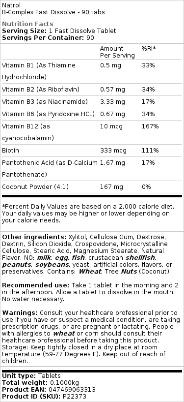 Sestavine: kokosov prah (4:1), vitamin B3 (kot niacinamid), pantotenska kislina (kot d-kalcijev pantotenat), vitamin B6 (kot piridoksin HCL), vitamin B2 (kot riboflavin), vitamin B1 (kot tiamin hidroklorid), Biotin, vitamin B12 (kot cianokobalamin) Druge sestavine: ksilitol, celulozni gumi, dekstroza, dekstrin, silicijev dioksid, krospovidon, mikrokristalna celuloza, stearinska kislina, magnezijev stearat, naravna aroma. NE: mleko, jajca, ribe, školjke, arašidi, soja, kvas, umetna barvila, arome ali konzervansi. Vsebuje: pšenico, oreščke (kokos). Priporočena uporaba: Vzemite 1 tableto zjutraj in 2 popoldne. Pustite, da se tableta raztopi v ustih. Voda ni potrebna. Opozorila: Pred uporabo se posvetujte s svojim zdravstvenim delavcem, če imate ali sumite na zdravstveno stanje, jemljete zdravila na recept, ste noseči ali dojite. Ljudje z alergijami na pšenico ali koruzo naj se pred jemanjem tega izdelka posvetujejo s svojim zdravnikom. Shranjevanje: Hraniti tesno zaprto na suhem mestu pri sobni temperaturi (59-77 stopinj F). Hraniti izven dosega otrok.
