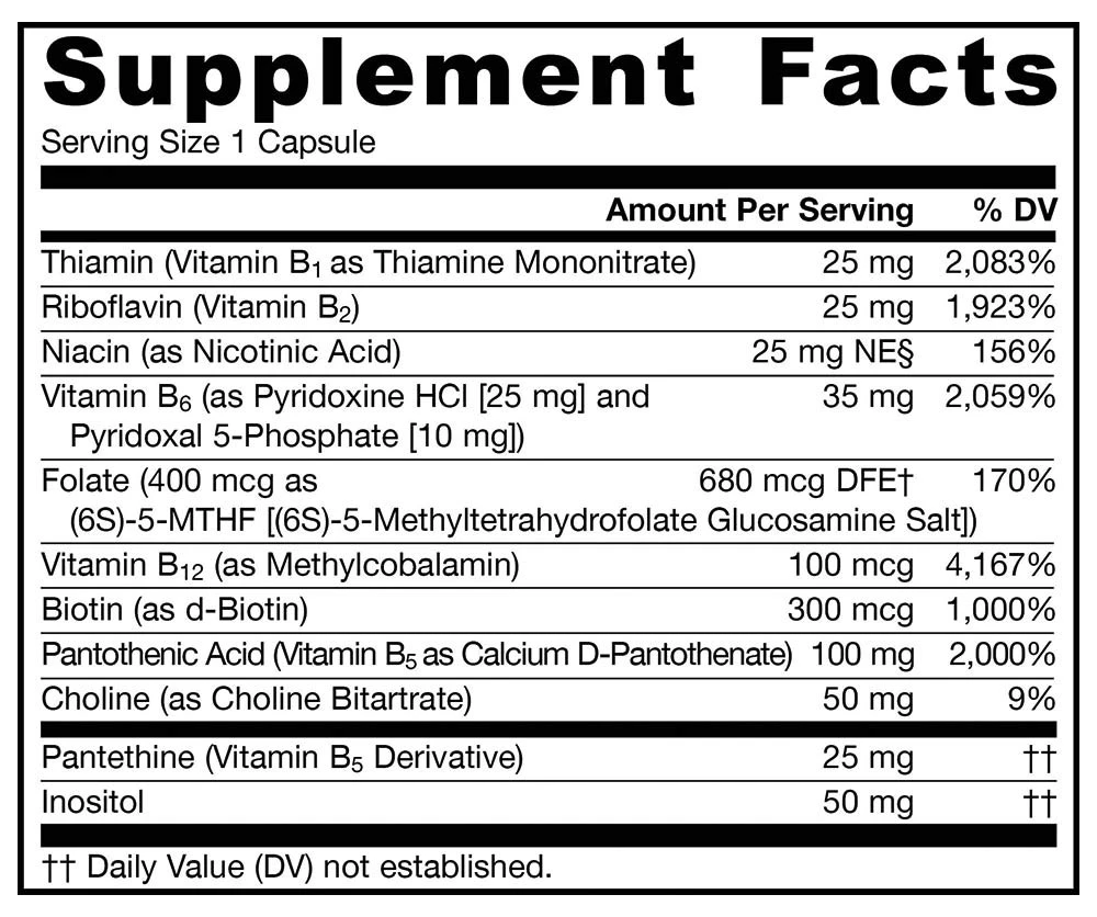Sestavine: vitamin B5 (kot kalcijev D-pantotenat), holin (kot holin bitartrat), inozitol, vitamin B1 (kot tiamin mononitrat), vitamin B2 (kot riboflavin), niacin (kot nikotinska kislina), vitamin B6 (kot piridoksin HCI) , pantetin (derivati vitamina B5), vitamin B6 (kot piridoksal 5-fosfat), folat (kot glukozaminska sol kvatrefolne (6S)-5-metiltetrahidrofolne kisline), biotin, vitamin B12 (kot metilkobalamin) Druge sestavine: silicijev dioksid, kalcijev fosfat magnezijev stearat (rastlinski vir), celuloza in stearinska kislina (rastlinski vir). Kapsula je sestavljena iz hidroksipropilmetilceluloze. Brez pšenice, glutena, soje, mlečnih izdelkov, jajc, rib/školjk ali arašidov/lepeščkov. Priporočena uporaba: Vzemite 1 kapsulo na dan z obrokom ali po navodilih svojega usposobljenega zdravstvenega delavca. Opozorila: Ta izdelek vsebuje vitamin B3 (niacin), ki lahko povzroči “niacinski naliv”, še posebej, če ga vzamete na prazen želodec. Simptomi so prehodni – običajno trajajo približno pol ure – in lahko vključujejo pekoč občutek, mravljinčenje in srbenje skupaj z pordelostjo kože. V nekaterih primerih se lahko pojavita omotica in/ali težko dihanje. Če se pojavi huda reakcija, popijte veliko vode in prenehajte z uporabo. Če imate zdravstveno stanje, ste noseči, dojite, poskušate zanositi, ste mlajši od 18 let ali jemljete zdravila, se pred uporabo tega izdelka posvetujte s svojim zdravnikom. Hraniti izven dosega otrok.