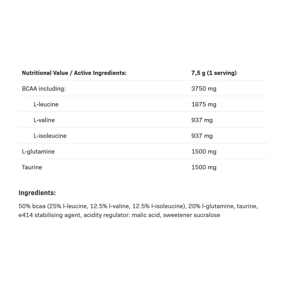 BCAA Max Support vsebuje mešanico L-izomerov aminokislin (L-leucina, L-izoleucina in L-valina), kreatin monohidrat, L-glutaminsko kislino in druge ključne aminokisline za mišično rast in regeneracijo. Ne vsebuje umetnih barvil, sladil ali okusov.