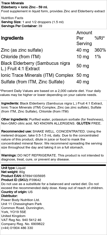 Sestavine: izvleček črnega bezga (Sambucus nigra L.) 4:1, kompleks ionskih mineralov v sledovih (ITM), cink (kot cinkov sulfat), sulfat (iz ITM, cinkov sulfat), klorid (iz ITM) Druge sestavine: prečiščena voda , kalijev sorbat (za svežino), citronska kislina brez GSO. NI ZNANIH ALERGENOV. BREZ GLUTENA. Priporočena uporaba: DOBRO PRETRESITE. KONCENTRIRANO. Vzemite 0,5-1,5 ml dnevno z odmerjeno kapalko. Zaradi koncentrirane narave tega izdelka ga razredčite s sokom ali hrano, da prikrijete koncentrirani mineralni okus. Priporočamo, da porcijo porazdelite čez dan in jo zaužijete na poln želodec. Opozorila: NE HRANITE V HLADILNIKU. Ta izdelek ni namenjen diagnosticiranju, zdravljenju ali preprečevanju katere koli bolezni.