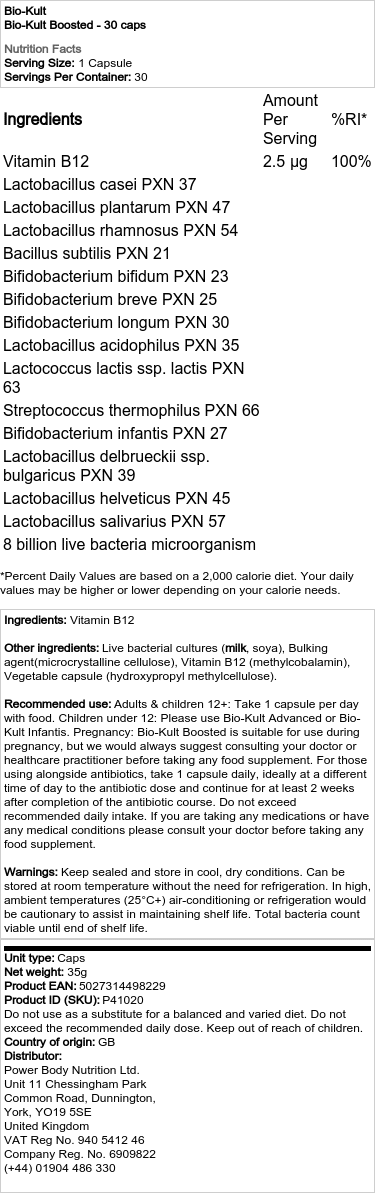 Sestavine: Vitamin B12 Druge sestavine: Žive bakterijske kulture (mleko, soja), sredstvo za povečanje prostornine (mikrokristalna celuloza), vitamin B12 (metilkobalamin), rastlinska kapsula (hidroksipropil metilceluloza). Priporočena uporaba: Odrasli in otroci 12+: Vzemite 1 kapsulo na dan s hrano. Otroci, mlajši od 12 let: Prosimo, uporabite Bio-Kult Advanced ali Bio-Kult Infantis. Nosečnost: Bio-Kult Boosted je primeren za uporabo med nosečnostjo, vendar vedno priporočamo, da se pred jemanjem katerega koli prehranskega dopolnila posvetujete s svojim zdravnikom oz. Za tiste, ki jemljejo skupaj z antibiotiki, vzemite 1 kapsulo na dan, po možnosti ob drugem času dneva kot odmerek antibiotika, in nadaljujte vsaj 2 tedna po končanem zdravljenju z antibiotiki. Ne prekoračite priporočenega dnevnega vnosa. Če jemljete kakršna koli zdravila ali imate kakršnakoli zdravstvena stanja, se pred jemanjem katerega koli prehranskega dopolnila posvetujte s svojim zdravnikom. Opozorila: Hranite zaprto in hranite na hladnem in suhem mestu. Lahko se hrani pri sobni temperaturi brez potrebe po hlajenju. Pri visokih temperaturah okolja (25 °C+) bi bila klimatska naprava ali hlajenje preventivni ukrep za ohranitev roka uporabnosti. Celotne bakterije so sposobne preživeti do konca roka uporabnosti.