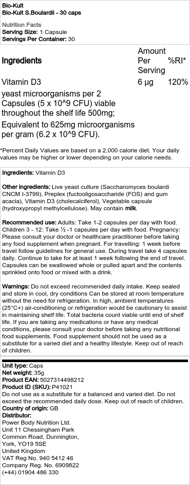 Sestavine: Vitamin D3 Druge sestavine: Živa kultura kvasovk (Saccharomyces boulardi CNCM I-3799), Preplex (fuktooligosaharid (FOS) in akacijev gumi), Vitamin D3 (holekalciferol), Rastlinska kapsula (hidroksipropilmetilceluloza). Lahko vsebuje mleko. Priporočena uporaba: Odrasli: 1-2 kapsuli na dan s hrano. Otroci 3 – 12: Vzemite ½ -1 kapsulo na dan s hrano. Nosečnost: Pred jemanjem katerega koli prehranskega dopolnila med nosečnostjo se posvetujte s svojim zdravnikom ali zdravnikom. Za potovanje: 1 teden pred potovanjem sledite navodilom za splošno uporabo. Med potovanjem zaužijte 4 kapsule dnevno. Nadaljujte z jemanjem še vsaj 1 teden po koncu potovanja. Kapsule lahko pogoltnete cele ali jih potegnete narazen in vsebino potresete po hrani ali zmešate s pijačo. Opozorila: Ne prekoračite priporočenega dnevnega vnosa. Hraniti zaprto in na hladnem in suhem. Lahko se hrani pri sobni temperaturi brez potrebe po hlajenju. Pri visokih temperaturah okolja (25 °C+) bi bila klimatska naprava ali hlajenje preventivni ukrep za ohranitev roka uporabnosti. Celotne bakterije so sposobne preživeti do konca roka uporabnosti. Če jemljete kakršna koli zdravila ali imate kakršne koli zdravstvene težave, se pred jemanjem kakršnih koli prehranskih dopolnil posvetujte s svojim zdravnikom. Prehranskih dopolnil ne smemo uporabljati kot nadomestilo za raznoliko prehrano in zdrav življenjski slog. Hraniti izven dosega otrok.