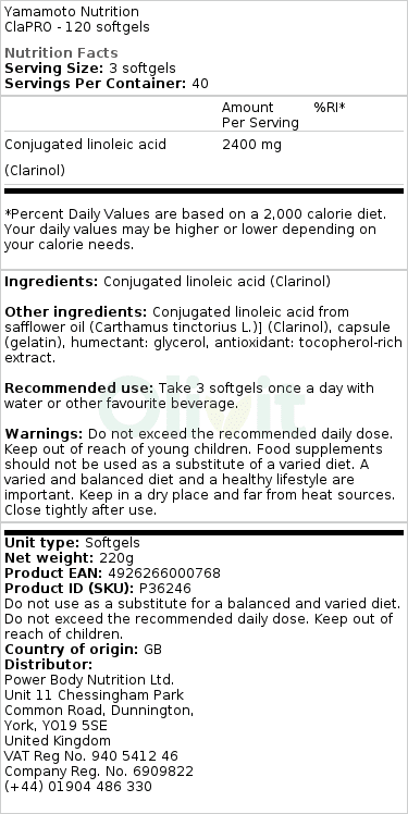 - Clarinol CLA (iz svetlinovega olja) – 2,4 g