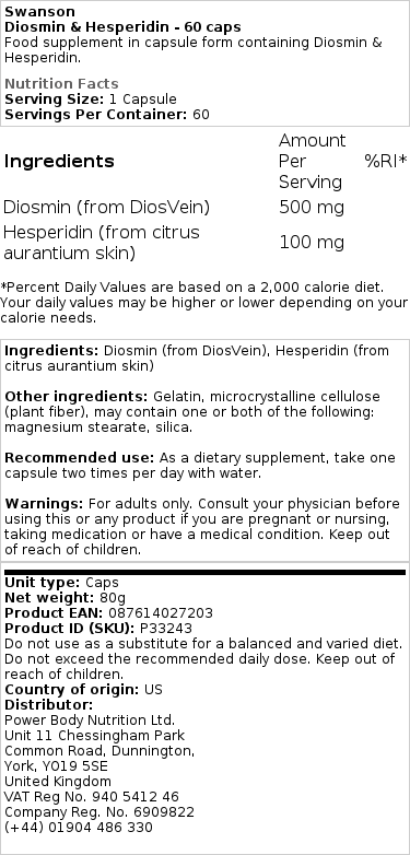 Sestavine: Diosmin (iz DiosVein), Hesperidin (iz kože Citrus aurantium) Druge sestavine: Želatina, mikrokristalna celuloza (rastlinska vlakna), lahko vsebuje enega ali oba od naslednjega: magnezijev stearat, silicijev dioksid. Priporočena uporaba: Kot prehransko dopolnilo zaužijte eno kapsulo dvakrat dnevno z vodo. Opozorila: Samo za odrasle. Pred uporabo tega ali katerega koli izdelka se posvetujte z zdravnikom, če ste noseči ali dojite, jemljete zdravila ali imate zdravstveno stanje. Hraniti izven dosega otrok.