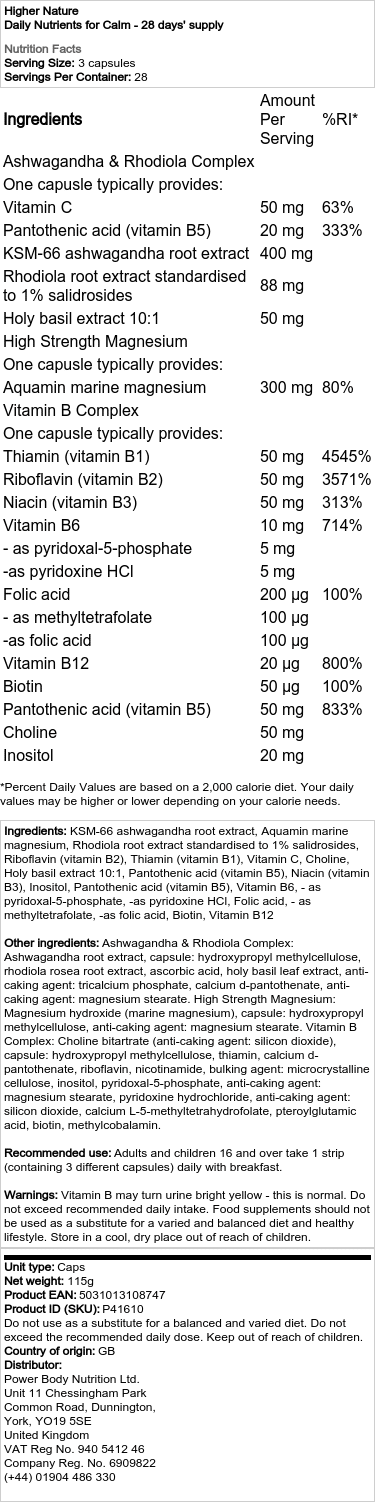 Sestavine: izvleček korenine ašvagande KSM-66, morski magnezij Aquamin, izvleček korenine rodiole, standardiziran na 1 % salidrozidov, riboflavin (vitamin B2), tiamin (vitamin B1), vitamin C, holin, izvleček svete bazilike 10:1, pantotenska kislina (vitamin B5), niacin (vitamin B3), inozitol, pantotenska kislina (vitamin B5), vitamin B6, – kot piridoksal-5-fosfat, – kot piridoksin HCl, folna kislina, – kot metil tetrafolat, – kot folna kislina, biotin, vitamin B12 Druge sestavine: Ashwagandha & Rhodiola Complex: izvleček korenine ašvagande, kapsula: hidroksipropil metilceluloza, izvleček korenine rhodiola rosea, askorbinska kislina, izvleček listov svete bazilike, sredstvo proti sprijemanju: trikalcijev fosfat, kalcijev d-pantotenat, sredstvo proti sprijemanju: magnezij stearat. Magnezij visoke trdnosti: magnezijev hidroksid (morski magnezij), kapsula: hidroksipropil metil celuloza, sredstvo proti strjevanju: magnezijev stearat. Kompleks vitamina B: holin bitartrat (sredstvo proti sprijemanju: silicijev dioksid), kapsula: hidroksipropil metilceluloza, tiamin, kalcijev d-pantotenat, riboflavin, nikotinamid, sredstvo za povečanje prostornine: mikrokristalna celuloza, inozitol, piridoksal-5-fosfat, sredstvo proti sprijemanju : magnezijev stearat, piridoksin hidroklorid, sredstvo proti sprijemanju : silicijev dioksid, kalcijev L-5-metiltetrahidrofolat, pteroilglutaminska kislina, biotin, metilkobalamin. Priporočena uporaba: Odrasli in otroci, stari 16 let in več, vzamejo 1 listič (ki vsebuje 3 različne kapsule) dnevno z zajtrkom. Opozorila: Vitamin B lahko urin obarva bledo rumeno – to je normalno. Ne prekoračite priporočenega dnevnega vnosa. Prehranskih dopolnil ne smemo uporabljati kot nadomestilo za raznoliko in uravnoteženo prehrano ter zdrav življenjski slog. Hraniti na hladnem in suhem mestu izven dosega otrok.