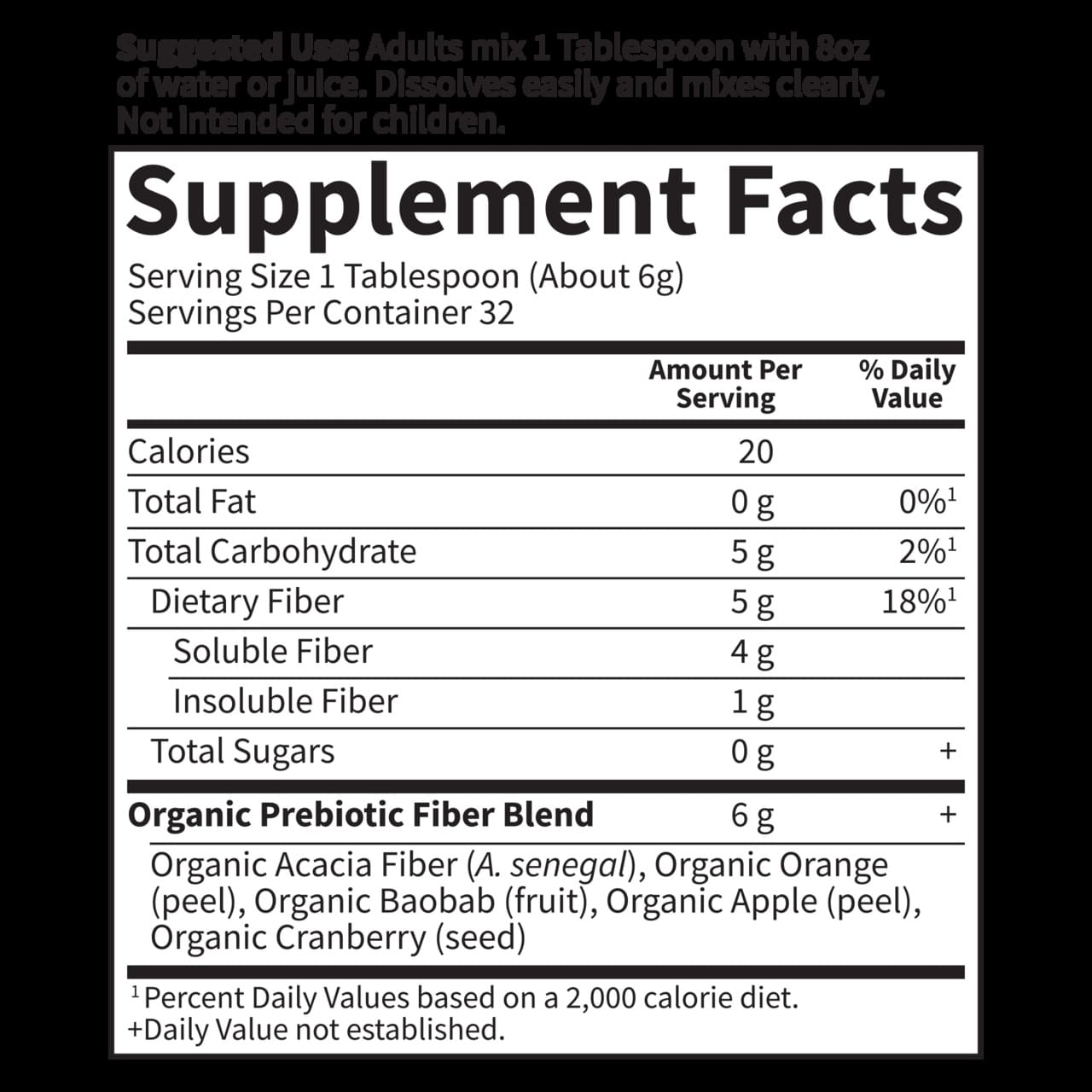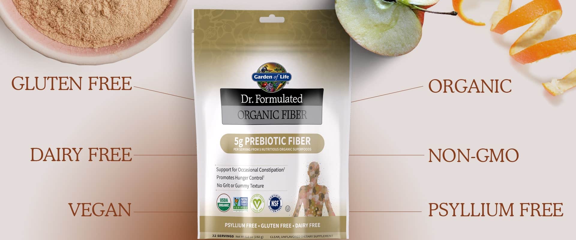 Pridobite svoj dnevni odmerek prebiotičnih vlaknin z Dr. Formulated Organic Fiber, Unflavored. Ta izdelek vsebuje 5 g prebiotičnih vlaknin iz petih hranljivih ekoloških superživil: akacije, pomarančne lupine, baobabovega sadja, jabolčnih lupin in brusničnega sadja.