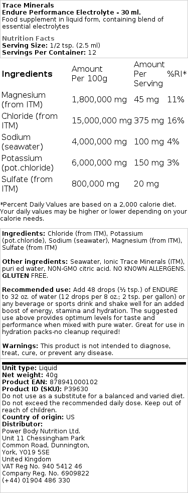 Sestavine: klorid (iz ITM), kalij (pot. klorid), natrij (morska voda), magnezij (iz ITM), sulfat (iz ITM) Druge sestavine: morska voda, ionski minerali v sledovih (ITM), prečiščena voda, citronska kislina brez GSO kislina. NI ZNANIH ALERGENOV. BREZ GLUTENA. Priporočena uporaba: Dodajte 48 kapljic (½ čajne žličke) ENDURE v 32 oz. vode (12 kapljic na 8 oz; 2 čajni žlički na galono) ali katere koli pijače ali športne pijače in dobro pretresite za dodaten dvig energije, vzdržljivosti in hidracije. Zgornja predlagana uporaba zagotavlja optimalno raven okusa in učinkovitosti, če jo zmešate s čisto vodo. Popoln za uporabo v vlažilnih paketih – ni potrebno čiščenje! Opozorila: Ta izdelek ni namenjen diagnosticiranju, zdravljenju ali preprečevanju katere koli bolezni.