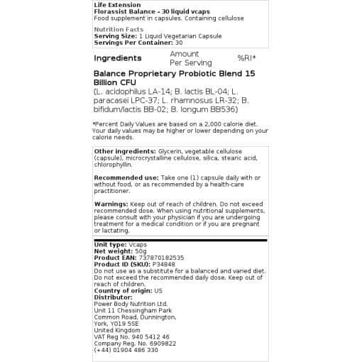 Sestavine: lastniška mešanica probiotikov Balance (B. breve Bbr8, L. plantarum 14D, B. animalis ssp. Lactic BLC1, L. paracasei IMC 502, L. rhamnosus IMC 501, L. acidophilus LA1, B. longum ssp. longum SP54) Druge sestavine: glicerin, rastlinska celuloza (kapsula), mikrokristalna celuloza, silicijev dioksid, stearinska kislina, klorofilin. Priporočena uporaba: Vzemite eno (1) kapsulo dnevno s hrano ali brez nje ali po priporočilu zdravnika. Opozorila: Hraniti izven dosega otrok. Ne prekoračite priporočenega odmerka. Pri uporabi prehranskih dopolnil se posvetujte z zdravnikom, če se zdravite zaradi zdravstvenega stanja ali če ste noseči ali dojite.