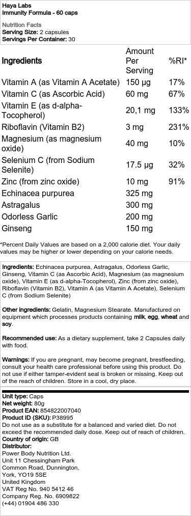 Sestavine: Echinacea purpurea, Astragalus, česen brez vonja, ginseng, vitamin C (kot askorbinska kislina), magnezij (kot magnezijev oksid), vitamin E (kot D-alfa-tokoferol), cink (iz cinkovega oksida), riboflavin (vitamin B2) , vitamin A (kot vitamin A acetat), selen C (iz natrijevega selenita) Druge sestavine: želatina, magnezijev stearat. Izdelano na opremi, ki predeluje izdelke, ki vsebujejo mleko, jajca, pšenico in sojo. Priporočena uporaba: Kot prehransko dopolnilo zaužijte 2 kapsuli dnevno s hrano. Opozorila: Če ste noseči, lahko zanosite, dojite, se pred uporabo tega izdelka posvetujte z zdravnikom. Ne uporabljajte, če je kateri koli pečat poškodovan ali manjka. Hraniti izven dosega otrok. Hraniti na hladnem in suhem mestu.