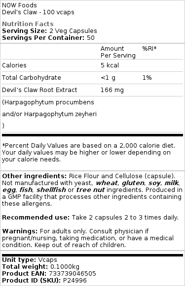 NOW Foods Devil’s Claw – 100 vcaps Prehransko dopolnilo v obliki kapsul. Vsebuje izvleček korenine hudičevega kremplja