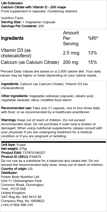 Life Extension Kalcijev citrat z vitaminom D – 200 vcaps Prehransko dopolnilo v kapsulah. Vsebuje vitamine