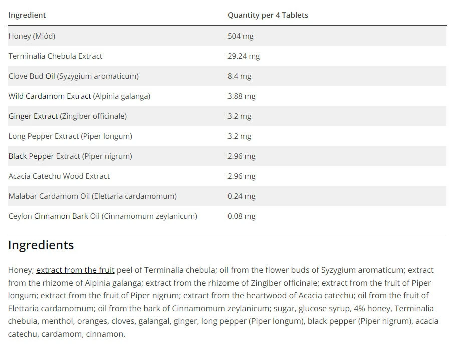 Sestavine: med, izvleček perikarpa mavrice, olje cvetnih brstov Syzygium aromaticum, izvleček korenike alpinia galanga, izvleček korenike zingiber officinale, izvleček plodov dolgolistne navadne navadne lupine, izvleček plodov navadne navadne lupine, izvleček srčike akacije catechu, olje plodov Elettaria cardamom, olje plodov Elettaria cardamom, Druge sestavine: sladkor, glukozni sirup, med (4,5%), sadna lupina mirobalana, mentol, aroma ingverja, začimbno olje, galangal, ingver, dolgi poper, črni poper, akacijeva gerbera, olje kardamoma, olje skorje cimeta. Priporočena uporaba: Priporočen dnevni odmerek: odrasli 1 pastila 3-4 krat na dan. Opozorila: Hraniti na hladnem in suhem mestu, zaščiteno pred direktno sončno svetlobo pri temperaturah pod 30°C. Ne shranjujte v hladilniku. Hraniti izven dosega otrok. Prehranskih dopolnil ne smemo uporabljati kot nadomestek za uravnoteženo in raznoliko prehrano. Ne prekoračite priporočenega dnevnega odmerka. Ni priporočljivo za otroke, mlajše od 2 let.