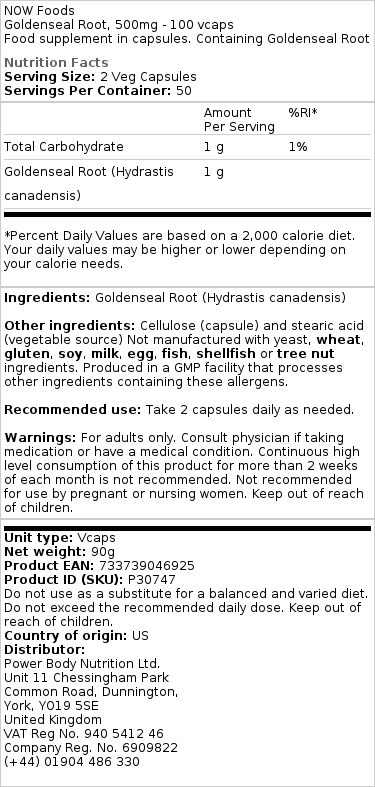 Sestavine: Korenina Goldenseal (Hydrastis canadensis) Druge sestavine: Celuloza (kapsula) in stearinska kislina (rastlinski vir) Ni narejeno iz kvasa, pšenice, glutena, soje, mleka, jajc, rib, školjk ali sestavin iz drevesnih oreščkov. Proizvedeno v obratu GMP, ki obdeluje druge sestavine, ki vsebujejo te alergene. Ni narejeno iz kvasa, pšenice, glutena, soje, mleka, jajc, rib, školjk ali sestavin iz drevesnih oreščkov. Proizvedeno v obratu GMP, ki obdeluje druge sestavine, ki vsebujejo te alergene. Priporočena uporaba: 2 kapsuli dnevno po potrebi. Opozorila: Samo za odrasle. Posvetujte se z zdravnikom, če jemljete zdravila ali imate zdravstveno stanje. Neprekinjeno visoko uživanje tega izdelka več kot 2 tedna vsak mesec ni priporočljivo. Ni priporočljivo za uporabo pri nosečnicah in doječih materah. Hraniti izven dosega otrok.