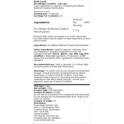 Sestavine: Kre-Alkalyn pufriziran kreatin monohidrat Druge sestavine: želatina (kapsula), celuloza, silicijev dioksid in magnezijev stearat (rastlinski vir). Ni narejeno iz sestavin pšenice, glutena, soje, mleka, jajc, rib, školjk ali drevesnih oreščkov. Proizvedeno v obratu GMP, ki obdeluje druge sestavine, ki vsebujejo te alergene. Priporočena uporaba: Vzemite 2 kapsuli 2- do 4-krat dnevno. Pijte veliko tekočine s tem izdelkom. Opozorila: Samo za odrasle. Ne prekoračite priporočenega odmerka. Posvetujte se z zdravnikom, če ste noseči/dojite, jemljete zdravila ali imate zdravstveno stanje. Če imate okvarjeno delovanje ledvic ali jemljete katero koli zdravilo na recept, ki vpliva na delovanje ledvic, se posvetujte s svojim zdravnikom. Hraniti izven dosega otrok.