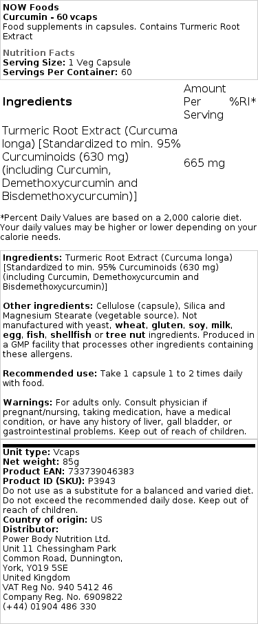 Kurkumin se v telesu slabo absorbira, zato smo v formulo dodali črni poper in olja iz kurkume in ingverja, ki povečajo njegovo biološko uporabnost. NOW Foods Kurkumin je brez glutena, brez GSO, primeren za vegane in vegetarijance.