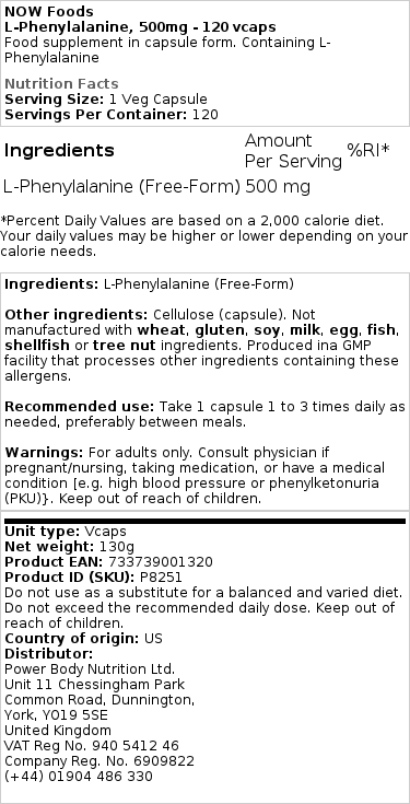 Sestavine: L-fenilalanin (prosta oblika) Druge sestavine: celuloza (kapsula). Ni narejeno iz sestavin pšenice, glutena, soje, mleka, jajc, rib, školjk ali drevesnih oreščkov. Proizvedeno v obratu GMP, ki obdeluje druge sestavine, ki vsebujejo te alergene. Priporočena uporaba: Vzemite 1 kapsulo 1- do 3-krat dnevno po potrebi, najbolje med obroki. Opozorila: Samo za odrasle. Posvetujte se z zdravnikom, če ste noseči/dojite, jemljete zdravila ali imate zdravstveno stanje [npr. visok krvni tlak ali fenilketonurija (PKU)}. Hraniti izven dosega otrok.