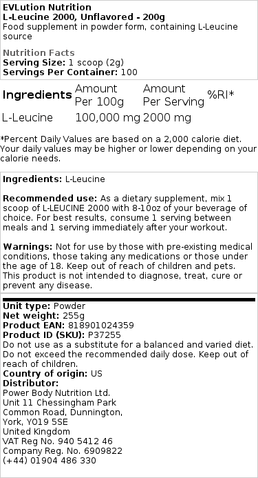 EVLution Nutrition – L-levcin 2000, brez okusa – 200g