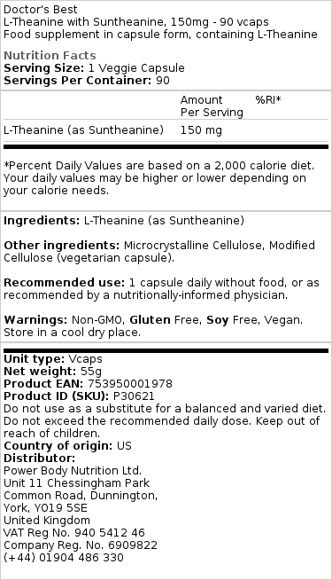 Sestavine: L-Theanine (kot Suntheanine) Druge sestavine: mikrokristalna celuloza, modificirana celuloza (vegetarijanska kapsula). Priporočena uporaba: 1 kapsula dnevno brez hrane ali po priporočilu nutricionista. Opozorila: Brez GSO, brez glutena, brez soje, vegansko. Hraniti na hladnem in suhem mestu.