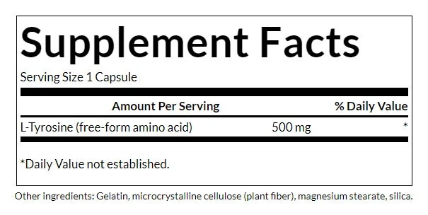 Sestavine: L-tirozin (aminokislina v prosti obliki) Druge sestavine: želatina, mikrokristalna celuloza (rastlinska vlakna), magnezijev stearat, silicijev dioksid. Priporočena uporaba: Kot prehransko dopolnilo zaužijte eno kapsulo na dan z vodo ali po priporočilu zdravnika. Opozorila: Samo za odrasle. Pred uporabo tega ali katerega koli izdelka se posvetujte z zdravnikom, če ste noseči ali dojite, jemljete zdravila ali imate zdravstveno stanje. Hraniti izven dosega otrok.