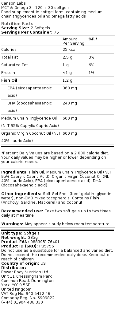 Količina na porcijo %RI* Kalorije 25 kcal Skupna maščoba 2,5 g 3 % nasičene maščobe 1 g 6 % Beljakovine <1 g 1 % Ribje olje 1,2 g EPA (eikozapentaenojska kislina) 360 mg DHA (dokozaheksaenojska kislina) 240 mg srednjeverižnega trigliceridnega olja NLT 95 % kaprilne kaprinske kisline) 600 mg organskega deviškega kokosovega olja (NLT 40 % lavrinske kisline) 600 mg *Odstotki dnevnih vrednosti temeljijo na dieti z 2000 kalorijami. Vaše dnevne vrednosti so lahko višje ali nižje, odvisno od vaših potreb po kalorijah.