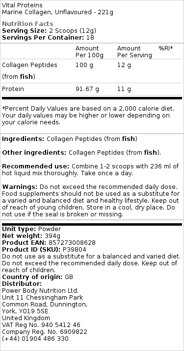 Količina na 100g Količina na porcijo %RI* Kolagenski peptidi (iz rib) 100g 10g Beljakovine 92g 9,2g *Odstotki dnevnih vrednosti temeljijo na dieti z 2000 kalorijami. Vaše dnevne vrednosti so lahko višje ali nižje, odvisno od vaših potreb po kalorijah.