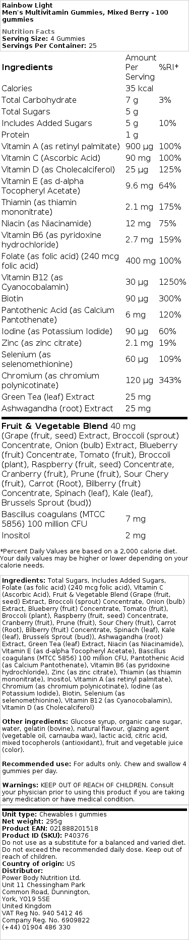 Naši multivitaminski gumiji za moške so posebej oblikovani za podporo zdravju moških. Vsebujejo mešanico jagodičevja, ki je bogata z antioksidanti in pomaga pri ohranjanju zdravega imunskega sistema.