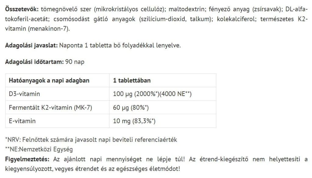 Glavne sestavine: Izdelek vsebuje vitamine D3 in K2, pridobljene iz naravnih virov. Te sestavine so znane po svoji čistosti in naravnem izvoru.