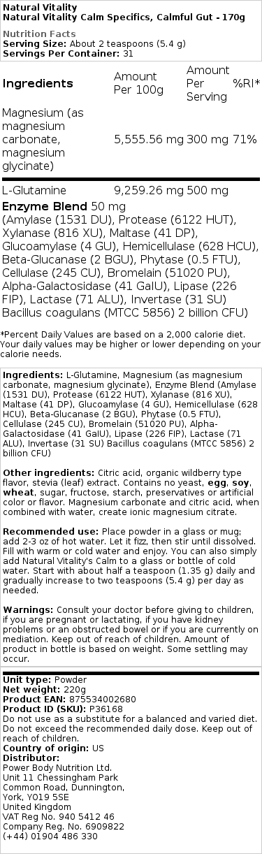 Sestavine: L-glutamin, magnezij (kot magnezijev karbonat, magnezijev glicinat), mešanica encimov (amilaza (1531 DU), proteaza (6122 HUT), ksilanaza (816 XU), maltaza (41 DP), glukoamilaza (4 GU), hemicelulaza (628 HCU), beta-glukanaza (2 BGU), fitaza (0,5 FTU), celulaza (245 CU), bromelain (51020 PU), alfa-galaktozidaza (41 GaIU), lipaza (226 FIP), laktaza (71 ALU) , Invertaza (31 SU) Bacillus coagulans (MTCC 5856) 2 milijarde CFU) Druge sestavine: citronska kislina, organska aroma gozdnih jagod, izvleček stevije (list). Magnezijev karbonat in citronska kislina v kombinaciji z vodo ustvarita ionski magnezijev citrat. Ne vsebuje kvasa, jajc, soje, pšenice, sladkorja, fruktoze, škroba, konzervansov ali umetnih barvil ali arom. Priporočena uporaba: Prašek dajte v kozarec ali skodelico; dodajte 2-3 oz tople vode. Pustite, da zacvrči in nato mešajte, dokler se ne raztopi. Napolnite z vročo ali hladno vodo in uživajte. Natural Vitality’s Calm lahko preprosto dodate v kozarec ali steklenico hladne vode. Začnite s približno pol čajne žličke (1,35 g) na dan in po potrebi postopoma povečajte na dve čajni žlički (5,4 g) na dan. Opozorila: Pred dajanjem otrokom se posvetujte z zdravnikom, če ste noseči ali dojite, če imate težave z ledvicami ali zamašenim črevesjem ali če ste trenutno na mediaciji. Hraniti izven dosega otrok. Količina izdelka v steklenički temelji na teži. Lahko pride do določene usedline.
