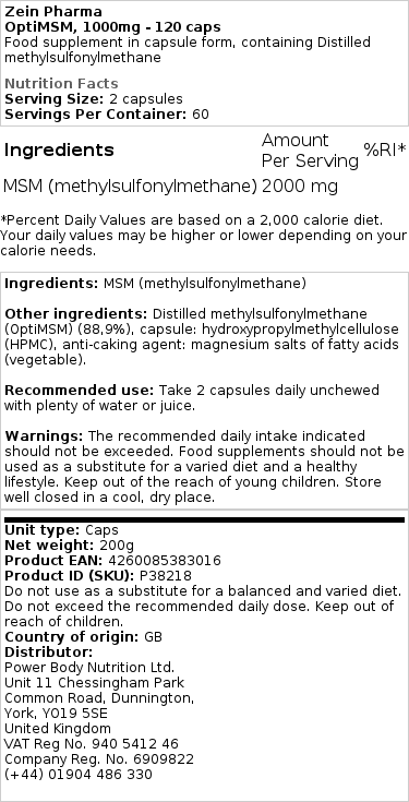 Sestavine: MSM (metilsulfonilmetan) Druge sestavine: destiliran metilsulfonilmetan (OptiMSM) (88,9%), kapsula: hidroksipropil metilceluloza (HPMC), sredstvo proti sprijemanju: magnezijeve soli maščobnih kislin (rastlinske). Priporočena uporaba: Vzemite 2 neprežvečeni kapsuli dnevno z veliko vode ali soka. Opozorila: Navedenega priporočenega dnevnega vnosa ne smete preseči. Prehranskih dopolnil ne smemo uporabljati kot nadomestilo za raznoliko prehrano in zdrav življenjski slog. Hraniti izven dosega majhnih otrok. Hraniti tesno zaprto na hladnem in suhem mestu.