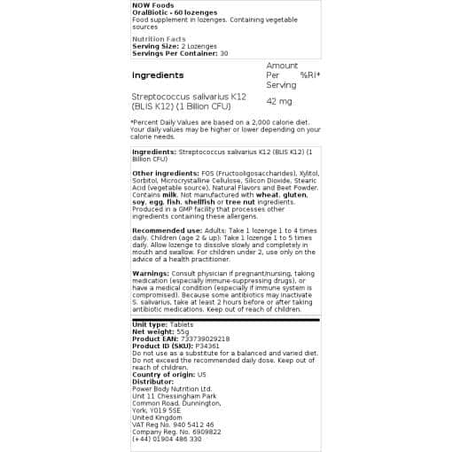 Oralbiotic by NOW Foods är ett utmärkt tillskott som är lätt att konsumera i en pastillform som fungerar bra för att ge anständiga 42 mg per portion av de friska bakterierna eller probiotika som kallas BLIS K12 eller “Streptococcus salivarius K12” som finns naturligt i munnen och halsen och fungerar fantastiskt för att bekämpa dåliga bakterier som kan orsaka otäcka sjukdomar som halsfluss och bakteriell tonsillit, detta tillägg fungerar också bra för att förhindra patogener och smink för eventuella brister i immunitet. Sammantaget känner jag att detta är ett fantastiskt hälso- och välmåendetillskott som är fördelaktigt för mig att konsumera utöver mina balanserade vitamin- och mineraltillskott som Orange Triad av Controlled Labs och Anavite av Gaspari Nutrition för att ge fullständigt stöd för hälsa och välbefinnande för att behålla min motstånd högre under de kallare vintermånaderna och när jag bantar med ett måttligt till kraftigt kaloriunderskott som kan ta ut sin rätt på immunförsvarets styrka. Jag skulle rekommendera detta som ett utmärkt naturligt tillskott för alla som lider av halsont och eventuella tonsilltillstånd för att minska de övergripande symtomen och till och med förhindra att de drabbas, om du för närvarande lider av halsont eller form av halsfluss rekommenderar jag att du konsumerar högre doser av upp till 4 sugtabletter per dag under korta perioder t.ex. 1 vecka för att ge mer hälsostöd. Jag känner att detta är ett ganska unikt hälsosamt bakteriebaserat tillskott som fungerar utmärkt för att stödja hälsan i halsen, näsan och öronen samt naturligt stödja frisk andedräkt och är lämplig för en rad olika individer. NU Food har ett enormt utbud av kosttillskott för att stödja en rad hälsotillstånd, så jag rekommenderar att du kollar in några av deras kosttillskott för att stödja dina framsteg i att förbättra din totala kroppssammansättning och för att stödja din allmänna hälsa och ditt välbefinnande.