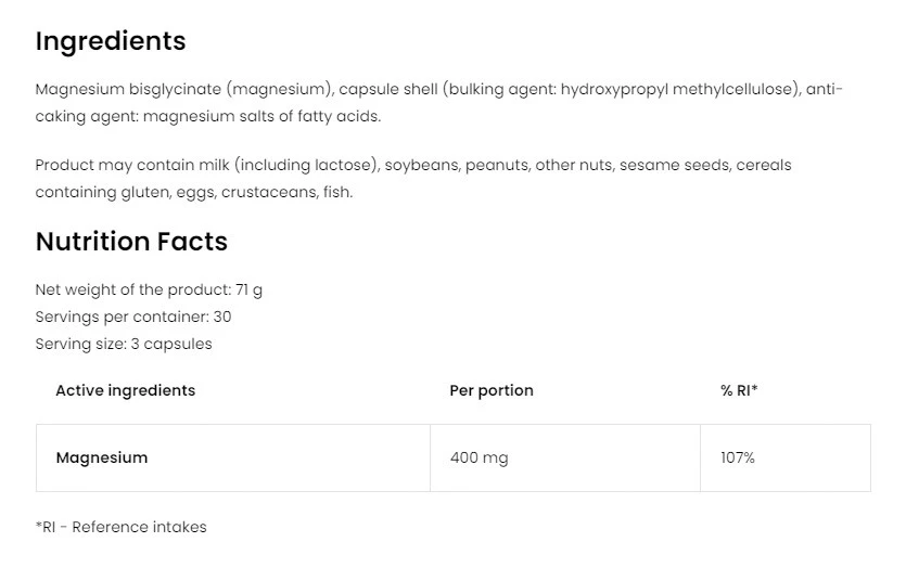 Izdelek vsebuje magnezijev glicinat, pridobljen na naraven način. Ta oblika magnezija je znana po svoji visoki čistosti in kakovosti.