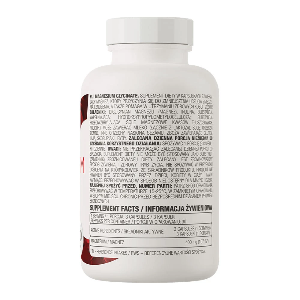 Visokokakovostni prehranski dodatek OstroVit Magnesium Glycinate vsebuje magnezij v obliki glicinata, ki je pridobljen iz naravnih virov. Izdelek je pakiran v priročno embalažo s 90 kapsulami.