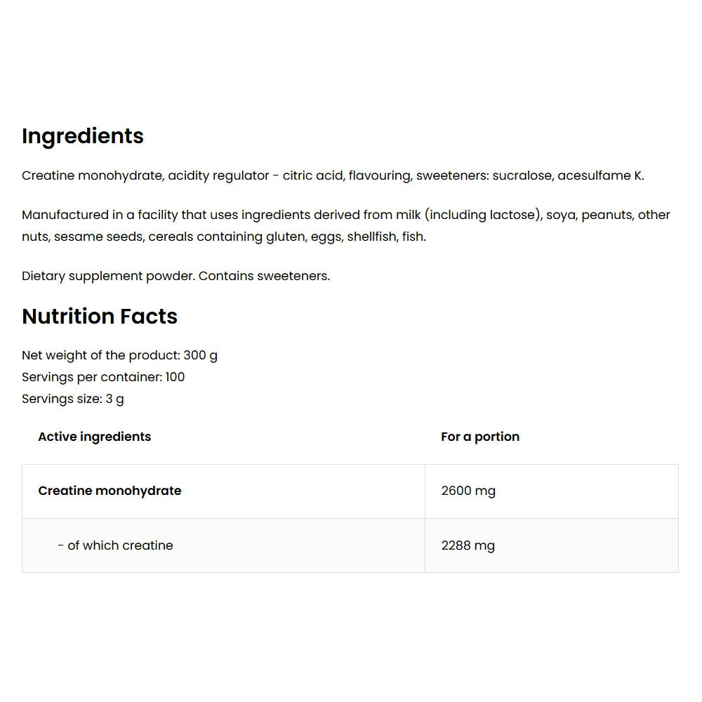 Glavne sestavine: Izdelek vsebuje kreatin monohidrat, pridobljen z visoko čistostjo. Kreatin je naravna snov, ki se običajno nahaja v hrani. Dodan je tudi naraven aroma kole za boljši okus.