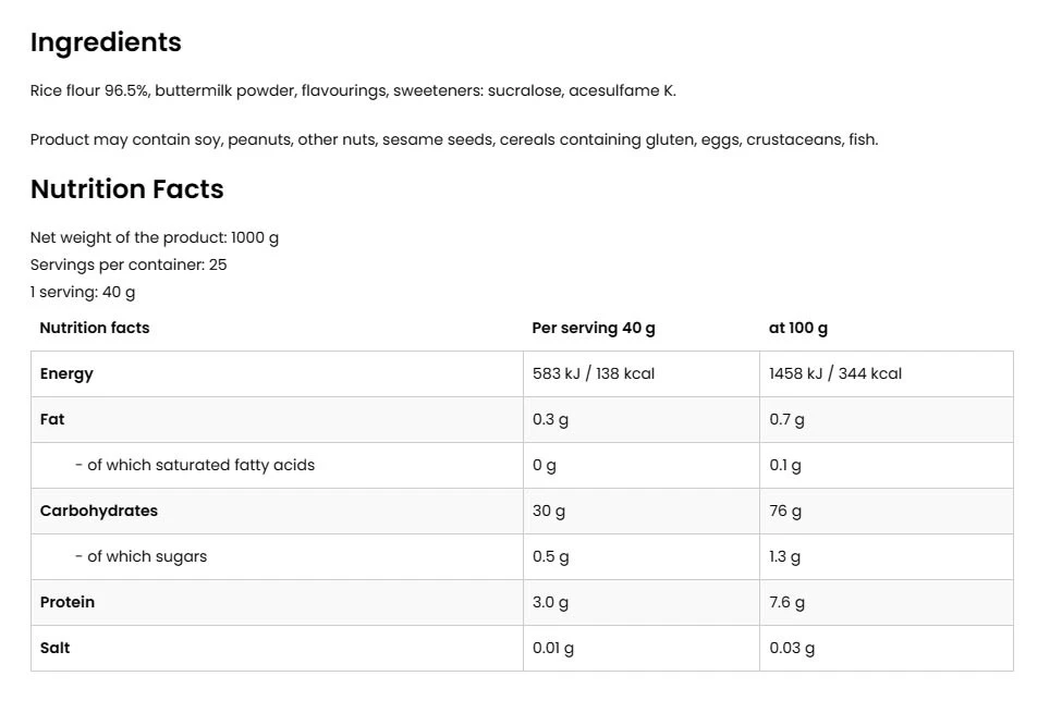Izdelek je narejen iz visokokakovostnih naravnih sestavin. Riževo moko dopolnjujejo naravne arome piškota in slanega karamele, ki skupaj ustvarjajo edinstveno kulinarično doživetje.