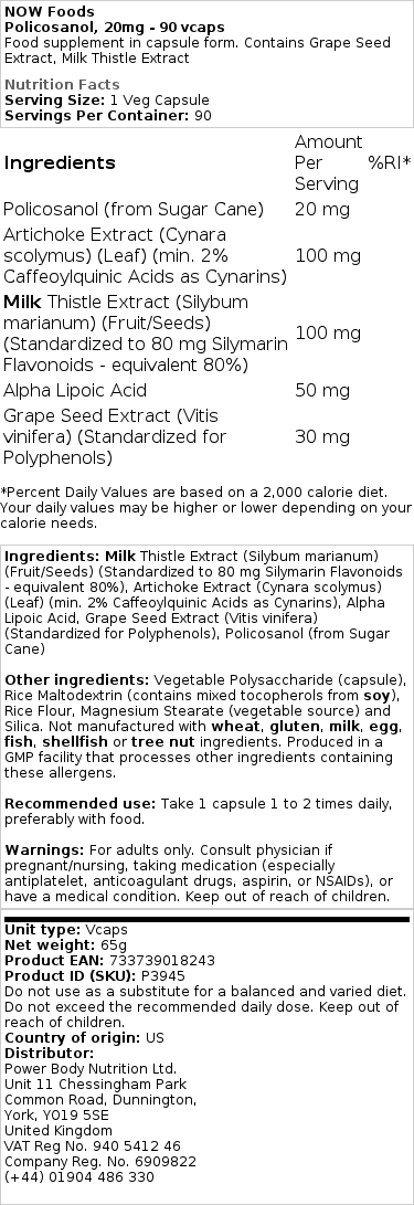 Sestavine: izvleček pegastega badlja (Silybum marianum) (plod/semena) (standardiziran na 80 mg flavonoidov silimarina – kar ustreza 80 %), izvleček artičoke (Cynara scolymus) (list) (najmanj 2 % kafeoilkvinske kisline kot cinar), alfa lipoična kislina, izvleček grozdnih pešk (Vitis vinifera) (standardiziran za polifenole), polikozanol (iz sladkornega trsa) Druge sestavine: rastlinski polisaharid (kapsula), rižev maltodekstrin (vsebuje mešanico tokoferolov iz soje), riževa moka, magnezijev stearat (rastlinski vir). Ni narejeno iz pšenice, glutena, mleka, jajc, rib, školjk ali drevesnih oreščkov. Proizvedeno v obratu GMP, ki obdeluje druge sestavine, ki vsebujejo te alergene. Priporočena uporaba: Vzemite 1 kapsulo 1- do 2-krat dnevno, najbolje s hrano. Opozorila: Samo za odrasle. Posvetujte se z zdravnikom, če ste noseči/dojite, jemljete zdravila (zlasti antitrombocitna zdravila, antikoagulante, acetilsalicilno kislino ali nesteroidna protivnetna zdravila) ali imate kakšno zdravstveno stanje. Hraniti izven dosega otrok.
