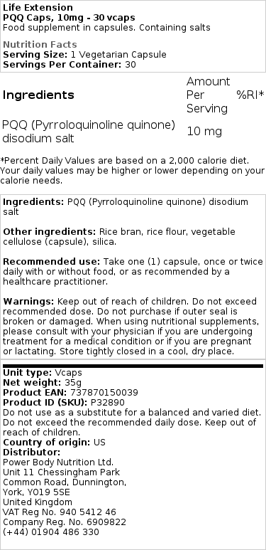 - PQQ (pirolokinolin kinon) – 10 mg