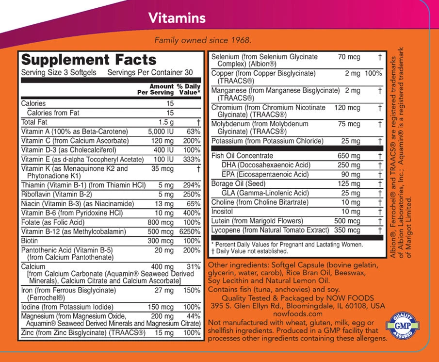 Sestavine: koncentrat ribjega olja, kalcij [iz kalcijevega karbonata (minerali, pridobljeni iz morskih alg aquamin), kalcijev citrat in kalcijev askorbat], DHA (dokozaheksaenojska kislina), magnezij (iz magnezijevega oksida, minerali iz morskih alg aquamin in magnezij oksidiranega boraga), ), Vitamin C (iz kalcijevega askorbata), vitamin E (kot d-alfa-tokoferil acetat), EPA (eikozapentaenojska kislina), železo (iz Ferrochel Iron Bisglycinate) (TRAACS), GLA (gama linolenska kislina), kalij (iz kalijevega klorida) , pantotenska kislina (vitamin B-5) (iz kalcijevega pantotenata), cink (iz cinkovega bisglicinata) (TRAACS), niacin (vitamin B-3) (kot niacinamid), vitamin B-6 (iz piridoksina HCl), holin (iz holin bitartrat), inozitol, riboflavin (vitamin B-2), tiamin (vitamin B-1) (iz tiamina HCl), vitamin A (100 % kot betakaroten), mangan (iz manganovega bisglicinata) (TRAACS), baker ( iz bakrovega bisglicinata) (TRAACS), folat (kot folna kislina), vitamin B-12 (kot metilkobalamin), lutein (iz cvetov ognjiča), biotin, likopen (iz naravnega izvlečka paradižnika), jod (iz kalijevega jodida), krom ( iz kromovega kelavita) (TRAACS), molibden (iz molibdenovega bisglicinata) (TRAACS), selen (iz selenovega aminokislinskega kompleksa) (TRAACS)), vitamin K (kot menakinon K2 in fitonadion K1), vitamin D-3 (kot holekalciferol) Druge sestavine: mehka kapsula (goveja želatina, glicerin, voda, rožičev), olje riževih otrobov, čebelji vosek, sojin lecitin in naravno olje limone. Ni narejeno iz pšenice, glutena, mleka, jajc, školjk ali drevesnih oreščkov. Proizvedeno v obratu GMP, ki obdeluje druge sestavine, ki vsebujejo te alergene. Priporočena uporaba: Zaužijte 3 mehke kapsule dnevno s hrano. Opozorila: Nenamerno preveliko odmerjanje železovih izdelkov je glavni vzrok smrtnih zastrupitev pri otrocih, mlajših od 6 let. Ta izdelek hranite izven dosega otrok. V primeru nenamernega prevelikega odmerjanja nemudoma pokličite zdravnika ali center za zastrupitve. Samo za odrasle. Posvetujte se z zdravnikom, če ste noseči/dojite, jemljete zdravila ali imate zdravstveno stanje. Hraniti izven dosega otrok. Pri tem izdelku lahko pride do naravnih barvnih variacij. Po odprtju hranite na hladnem in suhem mestu.