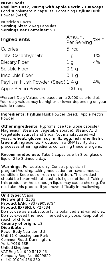 Sestavine: Psyllium Husk v prahu (semena), jabolčni pektin v prahu Druge sestavine: hipromeloza (celulozna kapsula), magnezijev stearat (rastlinski vir), stearinska kislina (rastlinski vir) in silicijev dioksid. Ni narejeno iz kvasa, pšenice, glutena, soje, mleka, jajc, rib, školjk ali sestavin iz drevesnih oreščkov. Proizvedeno v obratu GMP, ki obdeluje druge sestavine, ki vsebujejo te alergene. Priporočena uporaba: Vzemite 2 kapsuli z 8 oz. kozarec tekočine, 2 do 3 krat na dan. Opozorila: Samo za odrasle. Posvetujte se z zdravnikom, če ste noseči/dojite, jemljete zdravila ali imate zdravstveno stanje. Hraniti izven dosega otrok. Ta izdelek je treba zaužiti z vsaj polnim kozarcem tekočine. Jemanje tega izdelka brez dovolj tekočine lahko povzroči zadušitev. Ne jemljite tega izdelka, če imate težave s požiranjem.