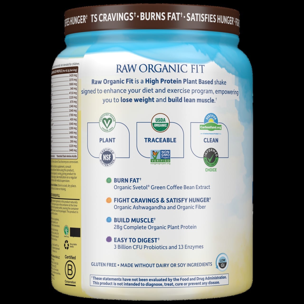 Raw Organic Fit je popolna beljakovinska mešanica, ki je namenjena hujšanju in izgorevanju maščob. Zasnovana je z mislijo na vse, ki želijo izgubiti odvečne kilograme in hkrati ohraniti zdrav način življenja. Ta čokoladna različica vsebuje 28 gramov popolnih rastlinskih beljakovin, ki so pridobljene iz ekoloških virov, kot so grah, riž, laneno seme in chia semena.