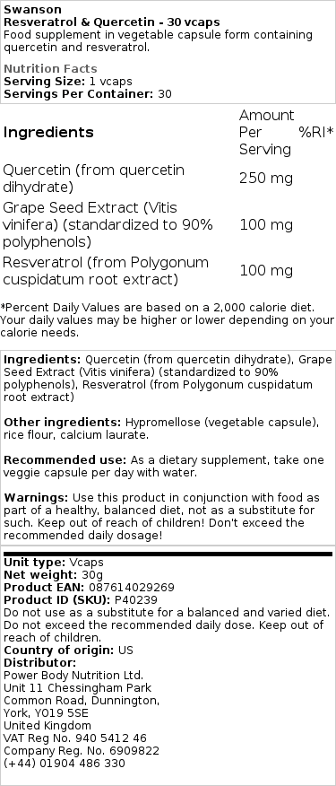 Sestavine: kvercetin (iz kvercetin dihidrata), izvleček grozdnih pečk (Vitis vinifera) (standardiziran na 90% polifenolov), resveratrol (iz izvlečka korenine Polygonum cuspidatum) Druge sestavine: hipromeloza (rastlinska kapsula), riževa moka, kalcijev lavrat. Priporočena uporaba: Kot prehransko dopolnilo zaužijte eno rastlinsko kapsulo na dan z vodo. Opozorila: Ta izdelek uporabljajte s hrano kot del zdrave, uravnotežene prehrane in ne kot nadomestek zanjo. Hraniti izven dosega otrok! Ne prekoračite priporočenega dnevnega odmerka!