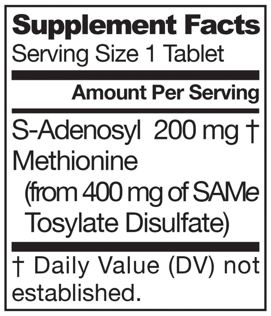 Sestavine: S-adenozil metionin (iz 400 mg SAM-e tosilat disulfata) Druge sestavine: celuloza, manitol, gliceril behenat, magnezijev stearat (rastlinski vir), silicijev dioksid, natrijev škrobni glikolat. Enterična obloga je sestavljena iz modificirane celuloze, trietil citrata, magnezijevega silikata in riboflavina. Alergeni: brez pšenice, brez glutena, brez soje, brez mlečnih izdelkov, brez jajc, brez rib/školjk, brez arašidov/oreščkov. Priporočena uporaba: Vzemite 1 tableto 1-krat ali 2-krat na dan na prazen želodec ali po navodilih svojega usposobljenega zdravstvenega delavca. Opozorila: Posamezniki, ki uporabljajo zdravila na recept, kot so antidepresivi, vključno s selektivnimi zaviralci ponovnega privzema serotonina (SSRI) in MAOI, naj se pred uporabo tega izdelka posvetujejo z zdravnikom. Posamezniki s Parkinsonovo boleznijo, bipolarno motnjo ali manično depresijo ne smejo uporabljati SAMe. Ne uporabljajte, če ste noseči ali dojite. Ne prekoračite priporočenega vnosa. Pri nekaterih ljudeh lahko povzroči gastrointestinalne motnje. Če občutite nelagodje, prenehajte z uporabo.