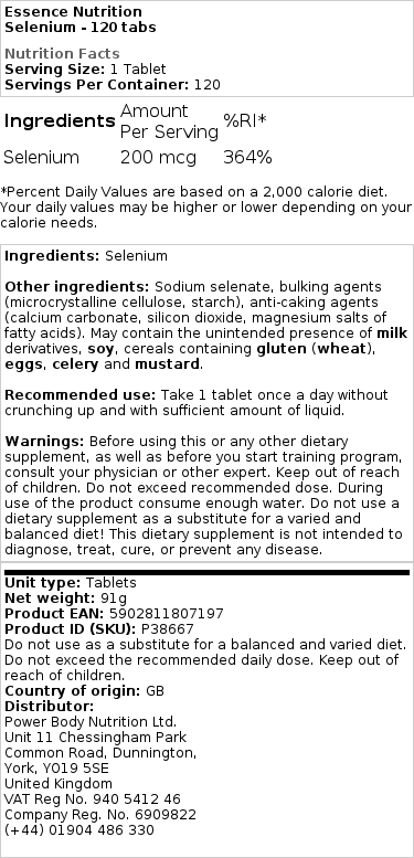 Ena tableta vsebuje 200 μg selena, kar predstavlja 364% priporočenega dnevnega vnosa.