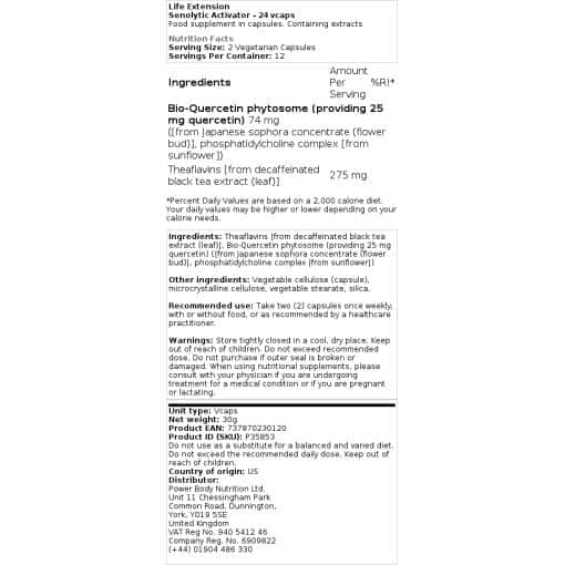 Sestavine: lastniška mešanica Bio-Fisetin (zagotavlja 18 % fisetina [iz izvlečka voščenega drevesa (steblo), 35 % galaktomananov [iz triplata (seme)]), teaflavine [iz brezkofeinskega izvlečka črnega čaja (listi)], fitosom Bio-Quercetin ( 25 mg kvercetina [iz koncentrata japonske sofore (cvetni brst)], kompleks fosfatidilholina [iz sončnice]), apigenin Druge sestavine: rastlinska celuloza (kapsula), sončnični lecitin, mikrokristalna celuloza, silicijev dioksid, rastlinski stearat. Priporočena uporaba: Vzemite tri (3) kapsule enkrat na teden ali po priporočilu zdravnika. Opozorila: Hraniti tesno zaprto na hladnem in suhem mestu. Hraniti izven dosega otrok. Ne prekoračite priporočenega odmerka. Ne kupujte, če je zunanji pečat zlomljen ali poškodovan. Pri uporabi prehranskih dopolnil se posvetujte z zdravnikom, če se zdravite zaradi zdravstvenega stanja ali če ste noseči ali dojite.