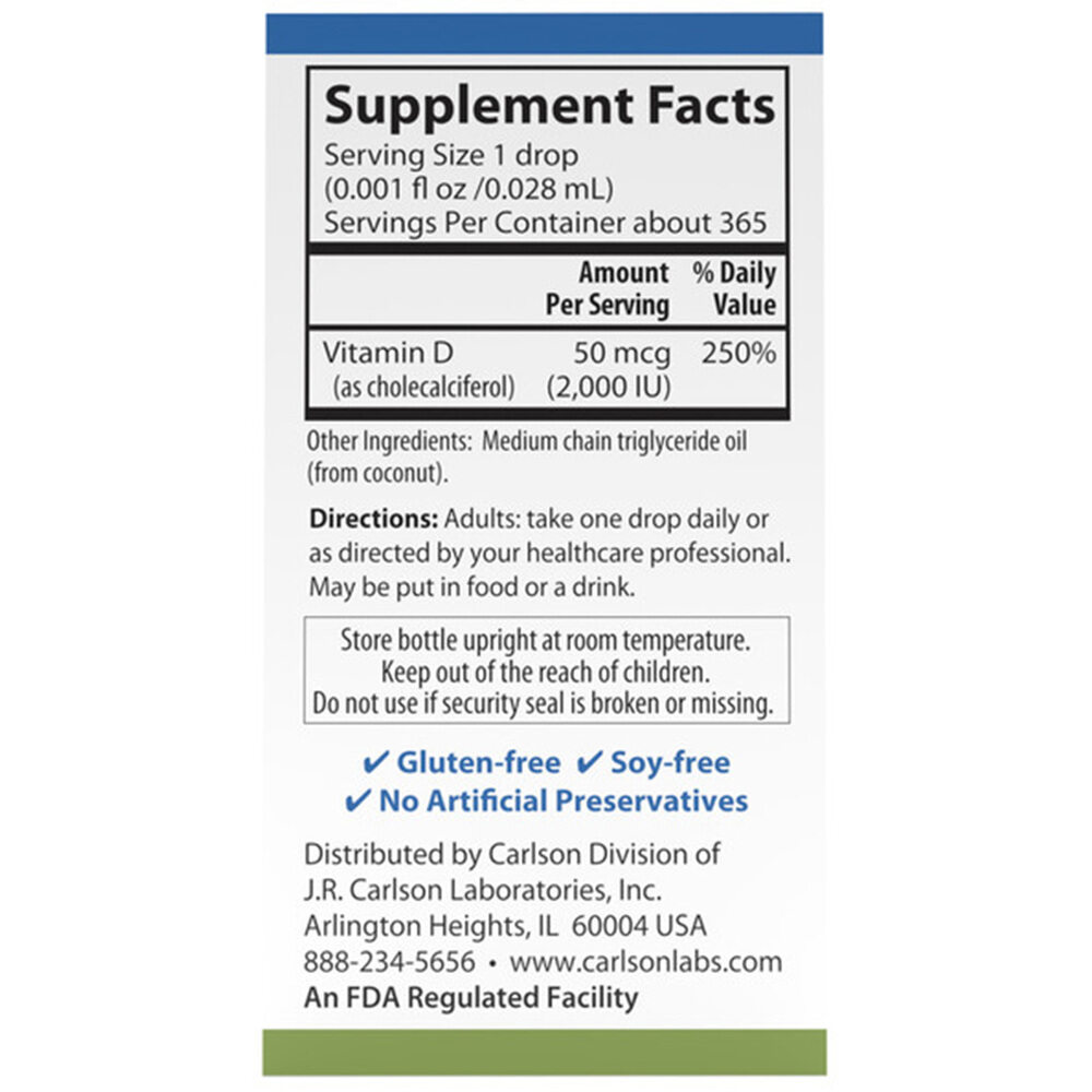 Sestavine: Vitamin D3 (kot holekalciferol) Druge sestavine: Srednjeverižno trigliceridno olje (kokosov in palmov vir). Priporočena uporaba: Odrasli vzamejo 1 kapljico dnevno ali po navodilih zdravnika. Lahko se doda hrani ali vmeša v druge tekočine, kot sta voda ali sok. Opozorila: Hraniti izven dosega otrok. Steklenico shranjujte pokonci. Ne uporabljajte, če je varnostni pečat poškodovan ali manjka.