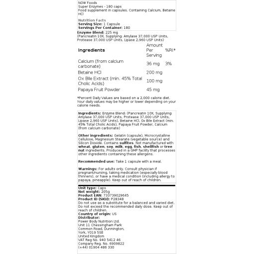 Super encimi vsebujejo tudi druge sestavine, kot so riževa moka, želatina (kapsula), magnezijev stearat (rastlinskega izvora) in silicijev dioksid.