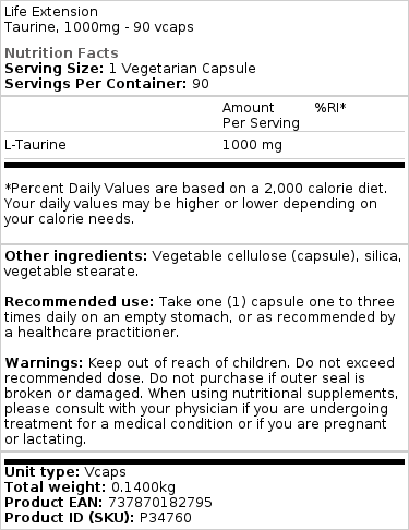 Life Extension Taurine, 1000 mg – 90 vcaps Prehransko dopolnilo v kapsulah. Vsebuje L-tavrin