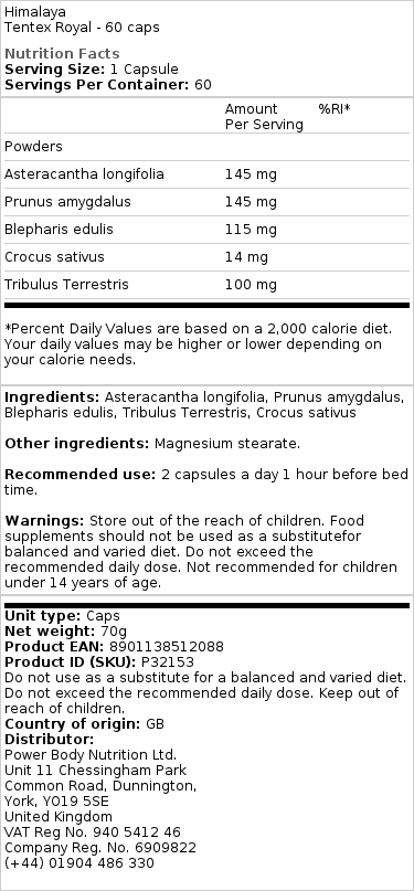 Himalaya Tentex Royal – 60 kapsul Prehransko dopolnilo v obliki kapsul, vsebuje sestavine rastlinskega izvora.