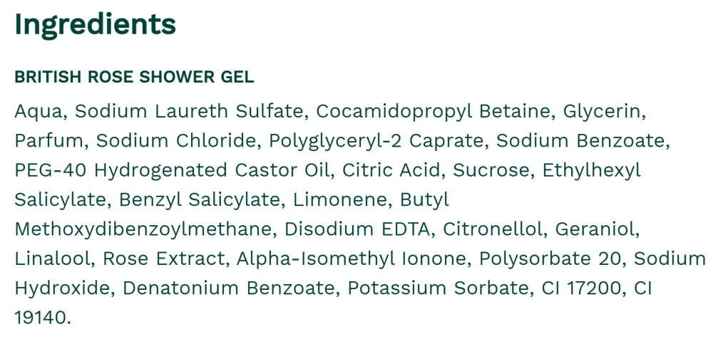 Glavne sestavine: Izdelek je obogaten z naravnimi izvlečki vrtnic, ki so pridobljeni na okolju prijazen način. Vsebuje tudi druge rastlinske sestavine,ki zagotavljajo nežno čiščenje kože.